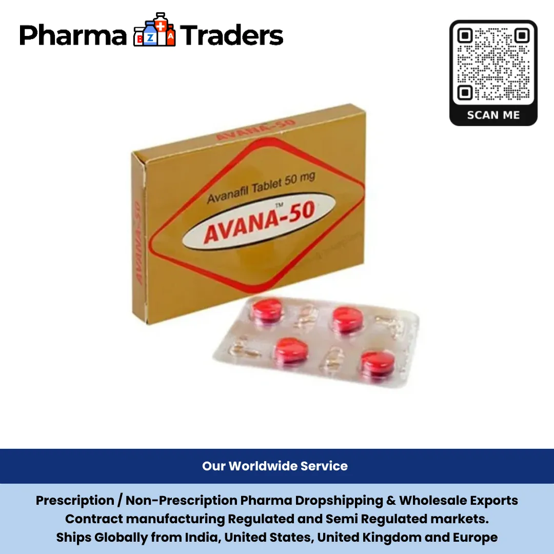 Avana 50 mg contains avanafil, a fast-acting PDE5 inhibitor used to treat erectile dysfunction (ED) in adult men. It increases blood flow to the penis during sexual stimulation, helping to achieve and maintain an erection.
